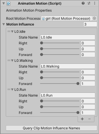 When you click in the 'Query Clip Motion Influence Names' it will generate the parameters the root motion will use to move the GameObject.